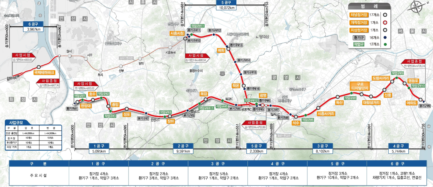 - 총 44.7km, 14개 정차역, 완전 지하화